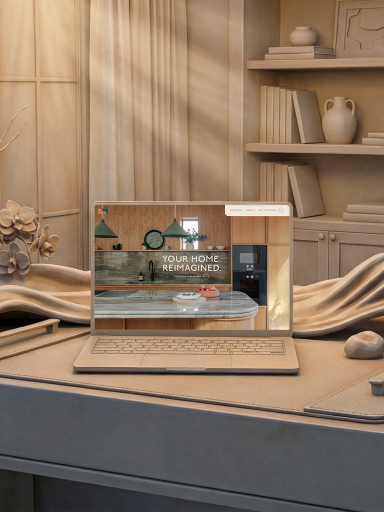 Decorative plaster relief mural of a laptop and architectural elements, representing the design and development aesthetic of Good Launch studio.